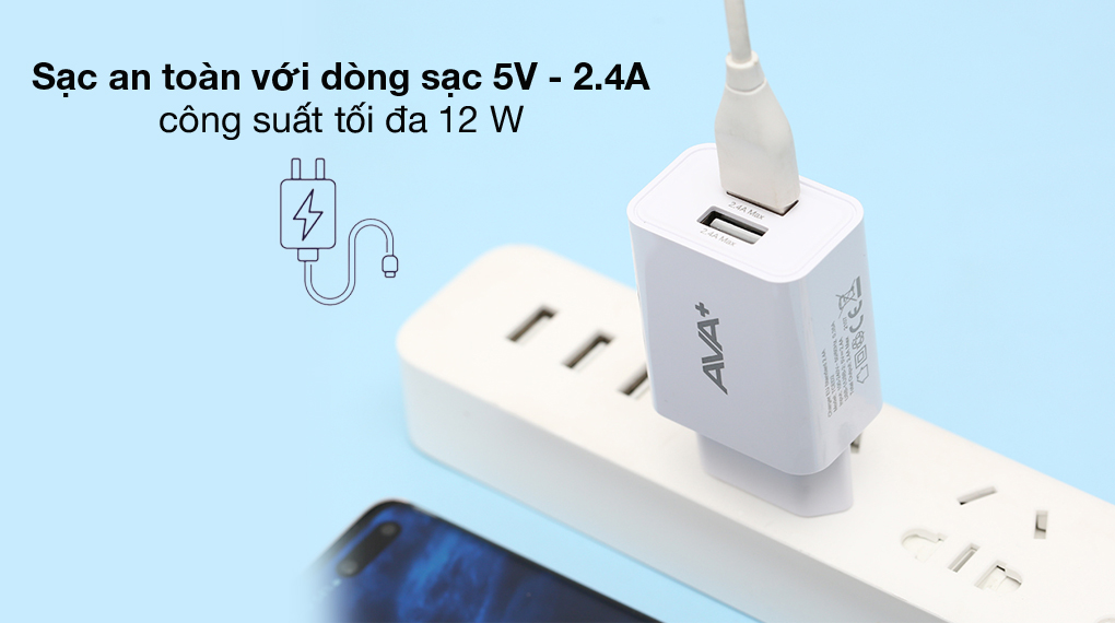 Adapter sạc trang bị dòng sạc chuẩn 5V - 2.4A nạp pin nhanh chóng, ổn định và an toàn cho điện thoại, pin sạc dự phòng, loa, đèn chiếu sáng,... thông qua cáp sạc phù hợp.