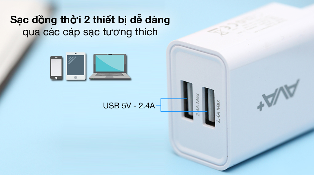 Adapter Sạc 2.4A Dual AVA+ TCED2 Trắng là sản phẩm của thương hiệu AVA+ uy tín, an tâm cho người dùng về chất lượng, dùng tiện lợi, sạc an toàn, rất đáng để lựa chọn.