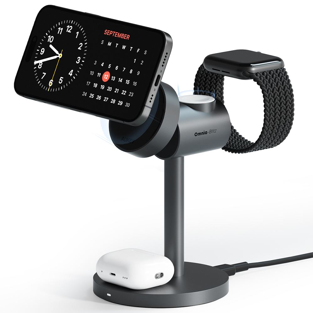 Điểm nổi bật của đế sạc Aukey LC-MC311 là khả năng sạc đồng thời ba thiết bị: iPhone, AirPods và Apple Watch. Điều này giúp loại bỏ sự rắc rối khi phải sử dụng nhiều bộ sạc và cáp khác nhau, mang đến một không gian làm việc hoặc sinh hoạt gọn gàng, ngăn nắp hơn. Chỉ cần một cổng đầu vào USB-C duy nhất, mọi thiết bị của bạn sẽ được cấp nguồn liền mạch.