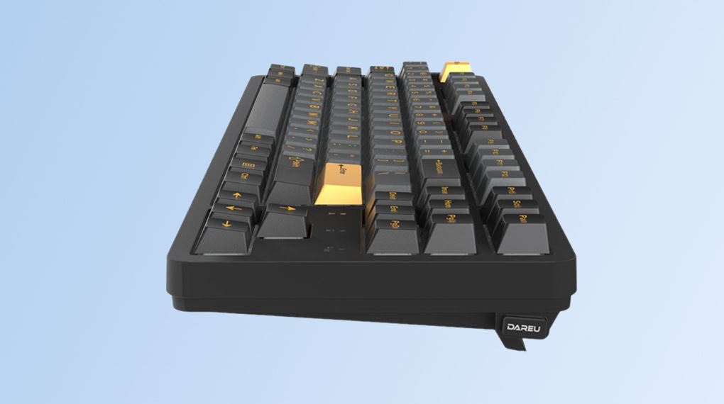Bàn phím DareU gây ấn tượng ngay từ cái nhìn đầu tiên với bố cục Tenkeyless 87 phím nhỏ gọn nhưng vẫn giữ trọn sự đầy đủ và tiện lợi. Sự kết hợp giữa tông màu tối mạnh mẽ và hệ thống LED RGB rực rỡ mang lại cảm giác hiện đại, nổi bật trên mọi bàn làm việc.