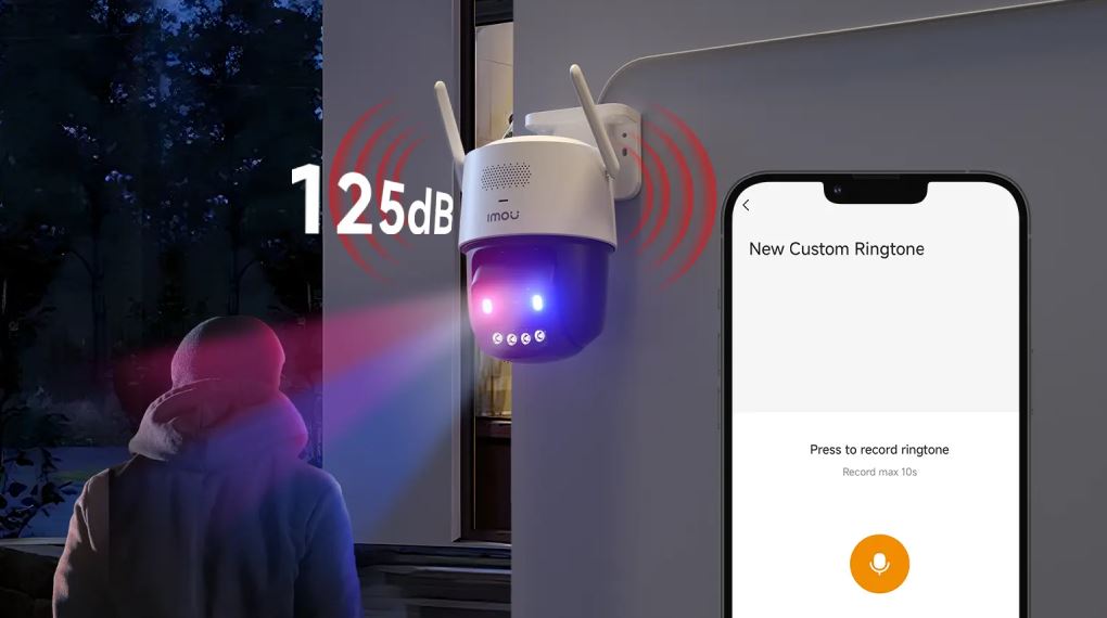 Về phòng vệ từ xa, camera tích hợp còi báo động và đèn chớp xanh và đỏ. Khi phát hiện kẻ lạ xâm nhập, camera sẽ lập tức kích hoạt còi báo và đèn chớp, đồng thời gửi cảnh báo về điện thoại của bạn. Thậm chí, bạn có thể sử dụng tính năng cảnh báo bằng giọng nói tùy chỉnh để ghi âm một lời cảnh báo riêng, tăng tính răn đe.