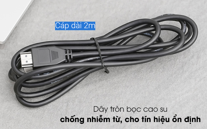 Thân dây cáp tròn đều, bọc cao su 2 lớp cao cấp bền tốt, chống nhiễu từ, tín hiệu phản hồi tốt, không bị méo khi phối ghép bên cạnh các thiết bị khác, cáp phù hợp với Macbook, laptop, trình điều khiển game, tivi, máy tính bảng,... Dây cáp Belkin F3Y02 màu đen bóng hiện đại, dài 2 m giúp kết nối các thiết bị ở khoảng cách xa dễ dàng, không lo thiếu dây cáp.