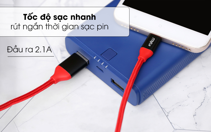 Cáp sạc với nguồn điện đầu ra 2.1A tăng khả năng sạc cho thiết bị, tiết kiệm thời gian.