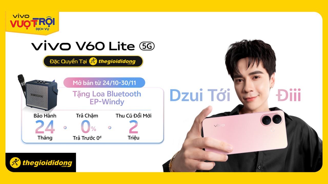 Hotsale mở bán vivo V60 Lite: Tặng ngay loa EP-Windy cực chất, cùng ưu đãi thu cũ đổi mới trợ giá đến 2 triệu đồng. vivo V60 Lite nổi bật với viên pin siêu trâu, hiệu năng bền bỉ và thiết kế sang trọng, mang đến trải nghiệm ổn định suốt ngày dài. Cơ hội sở hữu smartphone pin khủng giá siêu hời, thời gian có hạn.