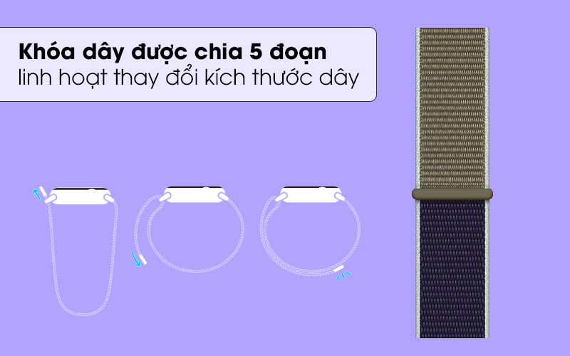 Khóa của dây đeo được chia 5 đoạn khác nhau người dùng có thể linh hoạt điều chỉnh phù hợp với cổ tay nhanh chóng và dễ dàng, đặc biệt toàn bộ thân dây có thể dính được.