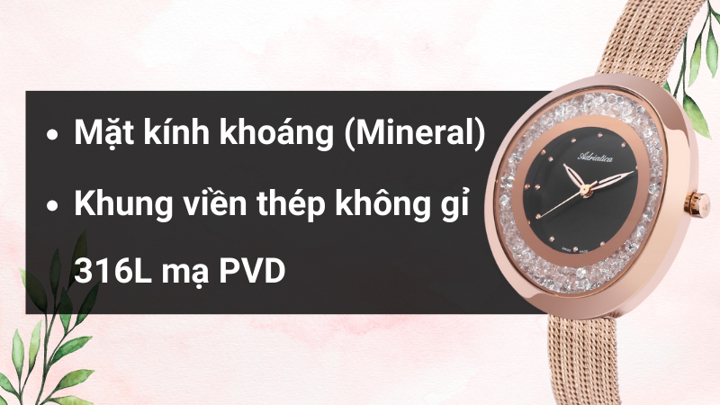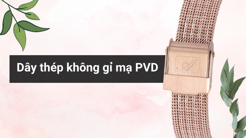 - Dây đeo thép không gỉ mạ PVD và khung viền thép không gỉ 316L mạ PVD có độ bền cao, chống ăn mòn, cho cảm giác mát tay khi mang.