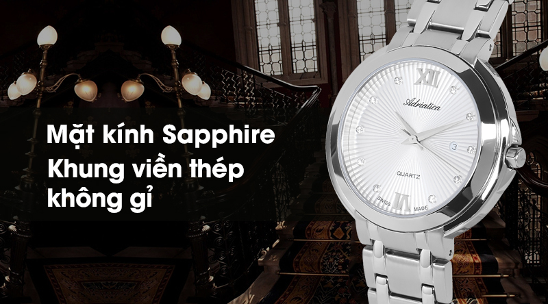 Đồng hồ nữ Adriatica A3812.5183Q sở hữu mặt kính Sapphire, khung viền bằng thép chống gỉ