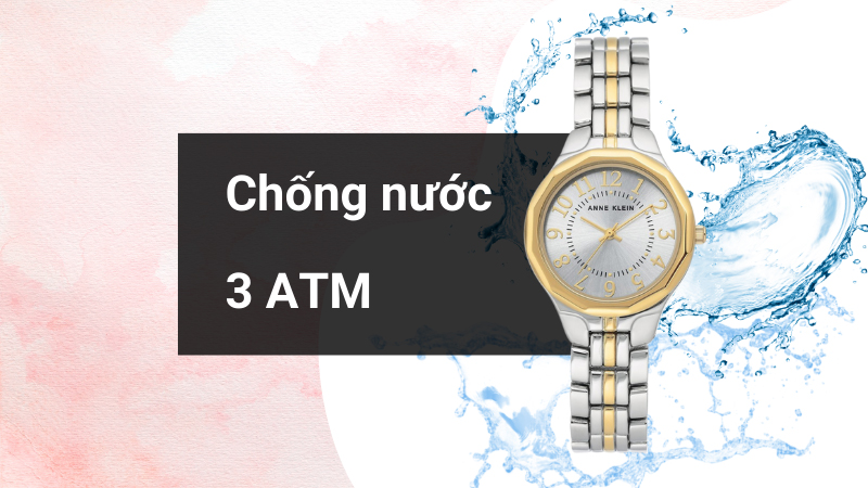 Hệ số chống nước 3 ATM, người dùng yên tâm đeo chiếc đồng hồ Anne Klein này khi đi mưa, rửa tay, không mang khi tắm, bơi, lặn