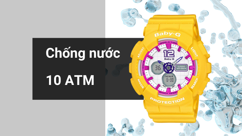 - Chống nước ở độ sâu 100m, an toàn khi đeo đi tắm, bơi, không mang đồng hồ khi lặn. Lưu ý: Không bấm các nút điều khiển khi bơi.