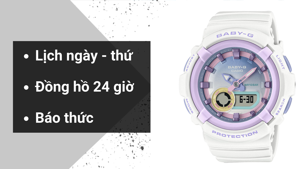 • Sản phẩm đồng hồ kim - điện tử này thuộc dòng Baby-G đến từ hãng Casio nổi tiếng và uy tín Nhật Bản. Với thiết kế trẻ trung hợp thời trang, phù hợp cho các cô nàng thích sự năng động và cá tính.