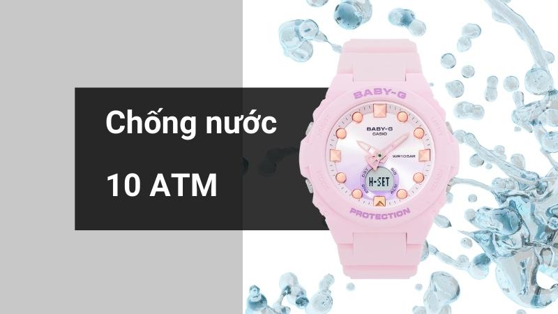 • Khả năng chống nước của chiếc đồng hồ Baby-G này lên đến 10 ATM vì thế bạn có thể yên tâm sử dụng trong các hoạt động hằng ngày như: đi rửa tay, đi mưa, đi tắm hoặc thậm chí là đi bơi. Lưu ý: không nên đeo khi đi lặn hoặc vặn bấm các nút trong quá trình sử dụng dưới nước.