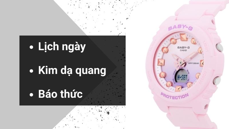 • Đồng hồ Baby-G BGA-320 42.4 mm Nữ BGA-320-4ADR sở hữu màu pastel mang phong cách pop nữ tính, kết hợp với những sắc màu dịu nhẹ tạo nên một thiết kế đẹp mắt. Kim đồng hồ, vạch chỉ giờ và các thành phần mặt số khác đều được phủ lớp kim loại sáng bóng, tinh tế, kết hợp với phần vỏ ngoài khá dày và dây đeo trắng tạo nên phong cách độc đáo. Chiếc đồng hồ này không chỉ đẹp mắt mà còn cung cấp nhiều chức năng hữu ích hàng ngày giúp các nàng có thể tự tin đeo mọi lúc mọi nơi.