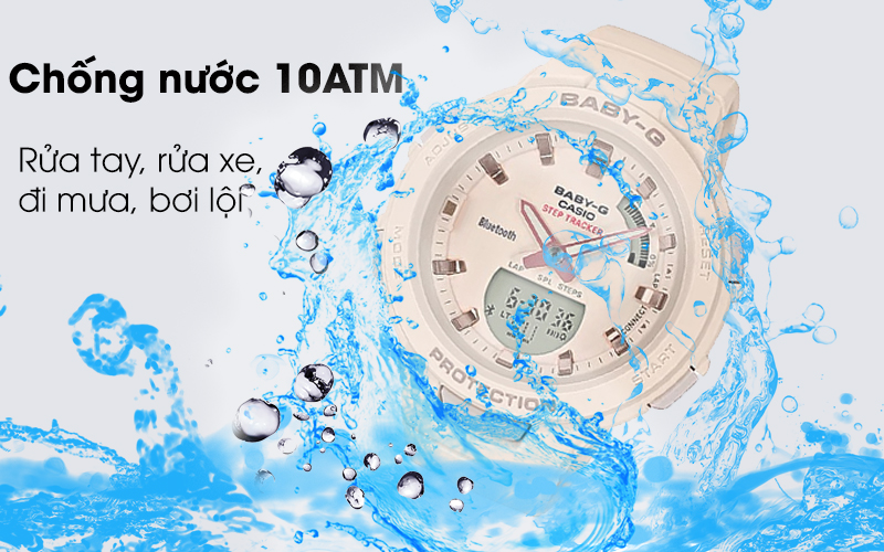 Chắc hẳn khi lựa chọn cho mình một chiếc đồng hồ ưng ý, ai cũng sẽ quan tâm đến khả năng chống nước lên hàng đầu. Với mẫu đồng hồ Baby-G này thì bạn có thể hoàn toàn yên tâm bởi vì chỉ số chống nước của nó lên đến 10ATM, người dùng thoải mái tắm, đi mưa hay thể thao dưới nước mà không sợ bị hư hỏng.