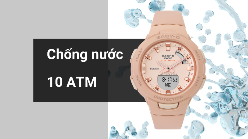 10 ATM là hệ số chống nước của chiếc đồng hồ này, các chị em thoải mái sử dụng khi đi tắm, đi bơi mà không lo bị vô nước. Lưu ý: không bấm các nút điều khiển của đồng hồ khi bơi, không mang khi lặn.