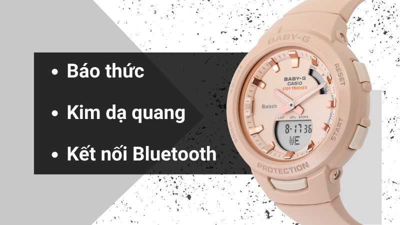 • Chiếc đồng hồ Baby-G có thể kết nối Bluetooth với ứng dụng "BABY-G Connected" để có thể theo dõi và giám sát các hoạt động thể dục, thể thao theo giờ, theo ngày và theo tháng. Đồng hồ còn có tính năng đếm bước chân theo mục tiêu hàng ngày của bạn, giúp bạn chủ động hơn trong việc luyện tập.