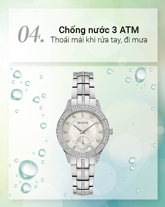 - Hệ số chống nước của đồng hồ nữ là 3 ATM nên thoải mái sử dụng khi rửa tay, đi mưa nhỏ nhưng không nên đeo khi đi tắm hoặc bơi lội