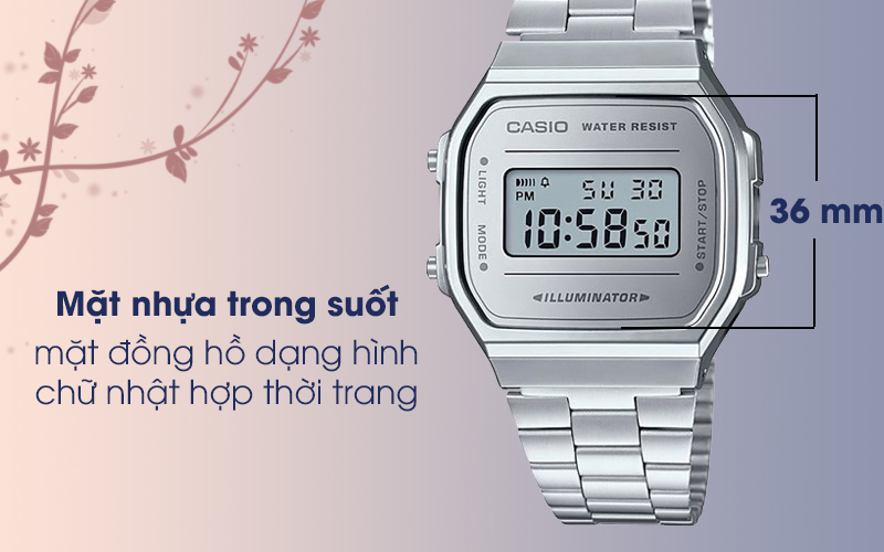 Có các thông tin thời gian hiển thị chữ, số điện tử, mặt của đồng hồ còn được bảo vệ bởi kính nhựa. Mang đến cho mặt đồng hồ sự an toàn cần thiết để bảo vệ cho màn hình điện tử bên trong cũng như làm cho đồng hồ trở nên thời trang hơn.