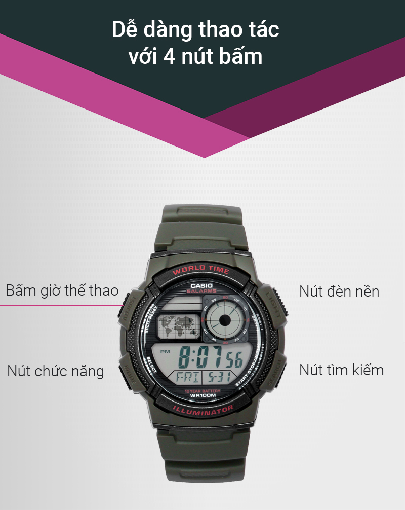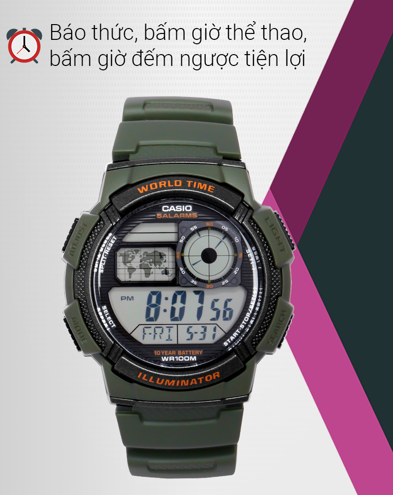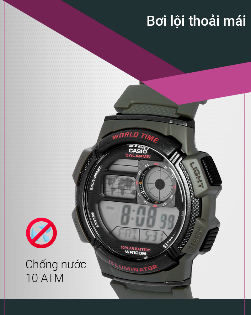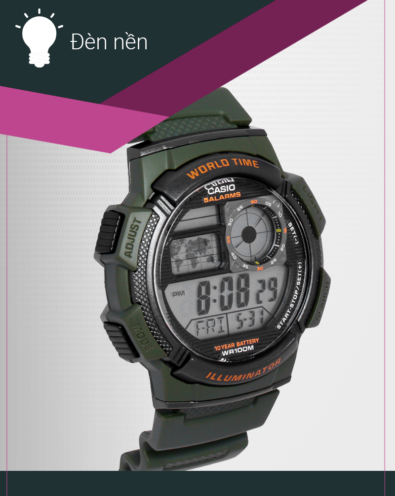 - Dễ dàng quan sát thời gian trong bóng tối nhờ có đèn nền chiếu sáng mạnh.