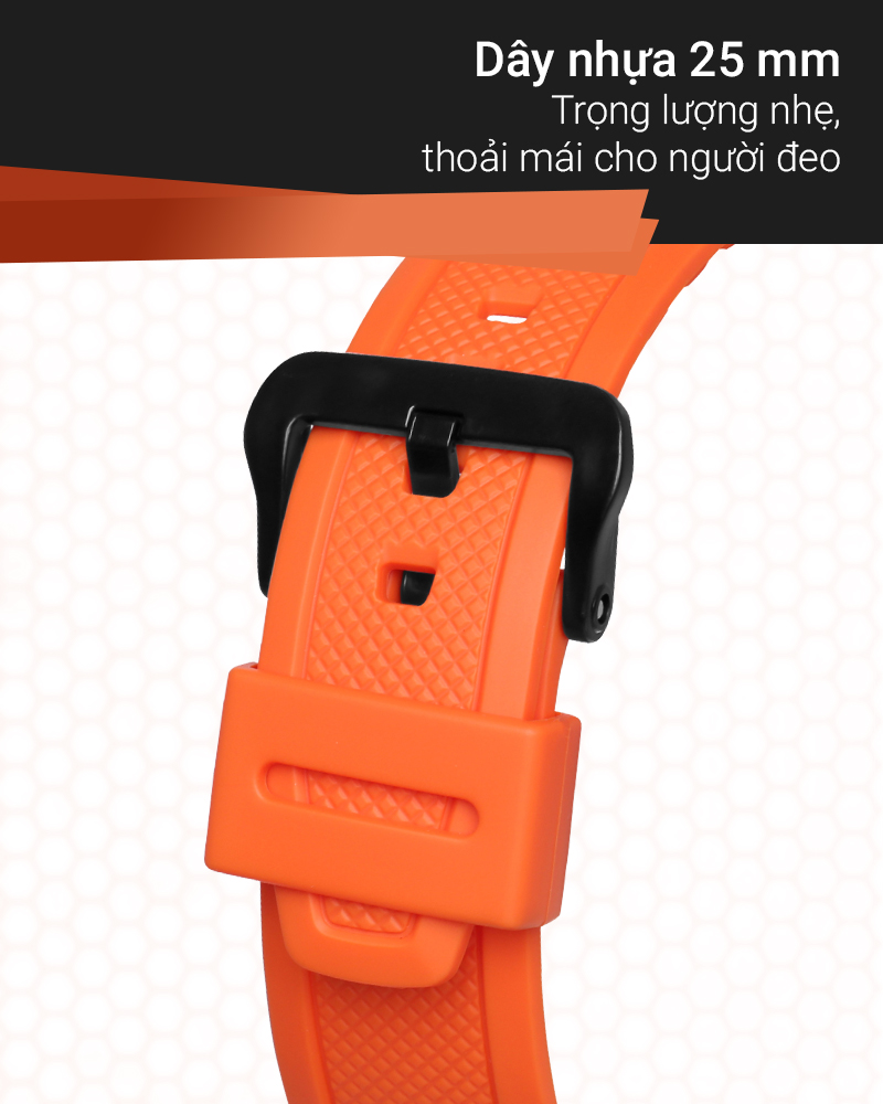 - Khung viền nhựa PC bền bỉ, có khả năng chịu va đập tốt. Dây đeo nhựa nhẹ nhàng êm ái, ôm trọn cổ tay người dùng
