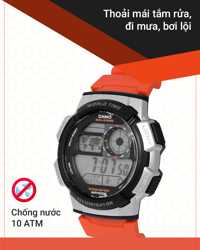 - Đeo đồng hồ ngay cả khi đi bơi và tắm rửa nhờ có hệ số chống nước 10 ATM, không nên đeo khi đi lặn