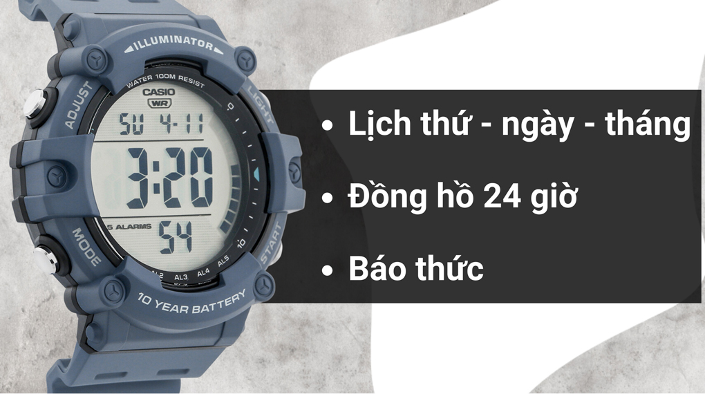 • Chiếc đồng hồ CASIO này không chỉ có thiết kế đẹp mắt mà còn mang đến cho bạn nhiều tiện ích đáng chú ý. Với chức năng bấm giờ thể thao và bấm giờ đếm ngược chiếc đồng hồ này sẽ trở thành một trợ thủ đắc lực trong các hoạt động thể thao và tập luyện của bạn. Đèn nền sáng giúp bạn dễ dàng đọc giờ dù trong môi trường thiếu sáng. Và khi có lịch ngày - thứ và lịch tháng năm, bạn sẽ luôn nắm bắt được ngày tháng chính xác.