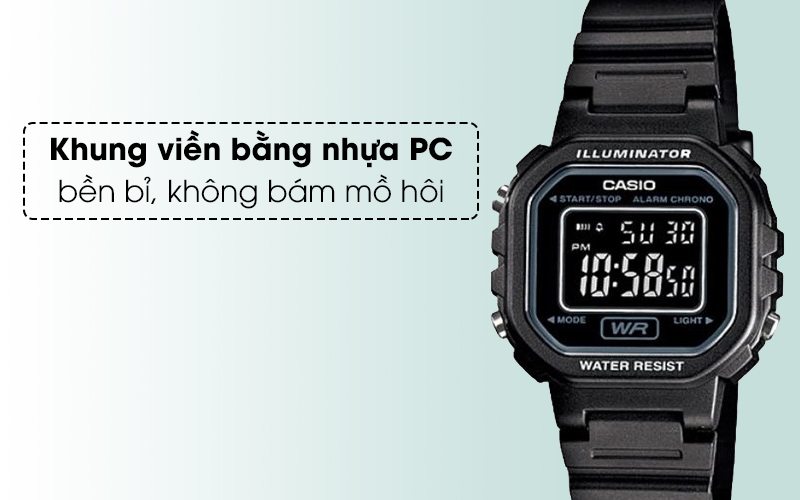 Mẫu đồng hồ Casio nam/nữ này có vỏ làm từ chất liệu làm từ nhựa PC, bộ khung này có trọng lượng tương đối nhẹ, cho người đeo cảm giác nhẹ tay hơn, không những vậy, nhựa PC còn có khả năng chịu va đập và độ bền khá tốt, giúp bảo vệ đồng hồ của bạn tốt hơn.
