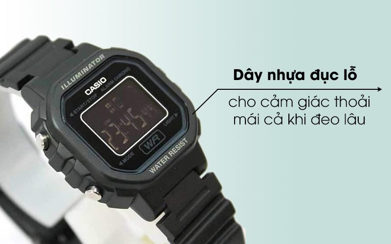 Mẫu đồng hồ điện tử này có dây đeo bằng nhựa nhẹ nhàng và chắc chắn, cùng hàng nút gài cho bạn chọn kích thước dây phù hợp, mang đến cho người dùng càm giác dễ chịu nhất có thể khi đeo đồng hồ trên tay.