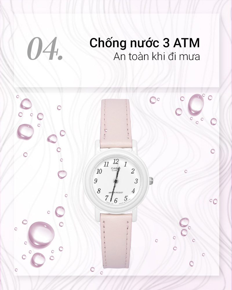 - Chống nước 3 ATM: Thoải mái đeo đồng hồ khi đi mưa, rửa tay, không mang khi tắm, bơi lội, lặn