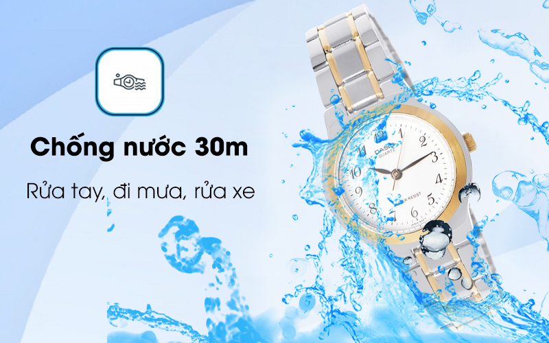 Rửa mặt hay thậm chí đi mưa mà không cần tháo đồng hồ vì đồng hồ Casio nữ có thể chịu được áp suất nước lên đến 3 ATM, giúp bạn yên tâm hơn khi tiếp xúc với chất lỏng.