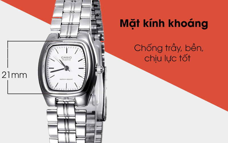 Mặt của chiếc đồng hồ đeo tay nữ này được làm từ chất liệu kính khoáng mang được tính chất cứng cáp giúp chống trầy, chống vỡ hiệu quả khi sơ ý va chạm. Đường kính mặt 21 mm nhỏ nhắn và phù hợp với cổ tay của phái nữ. Thiết kế kim mảnh cùng với màu sắc mặt sáng sủa giúp dễ dàng quan sát giờ.