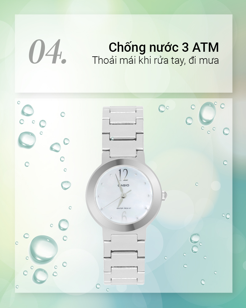 - Yên tâm đeo đồng hồ khi đi mưa, rửa tay với chống nước 3 ATM, không mang khi tắm hay bơi lội