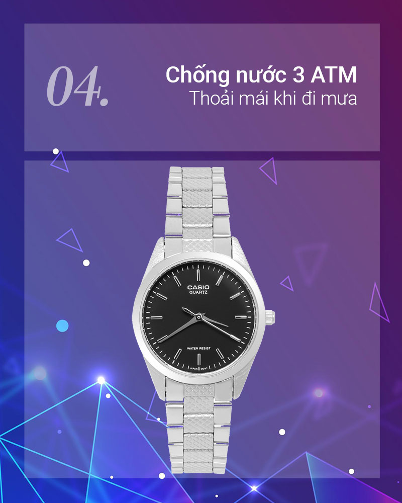 - Độ chống nước 3 ATM: An toàn khi đeo đồng hồ đi mưa, rửa tay, không mang khi tắm, bơi lội