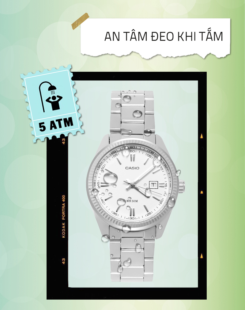 - Mẫu đồng hồ nữ này có hệ số chống nước là 5 ATM vì vậy hoàn toàn có thể yên tâm đeo khi tắm, rửa tay, đi mưa, không đeo khi bơi, lặn