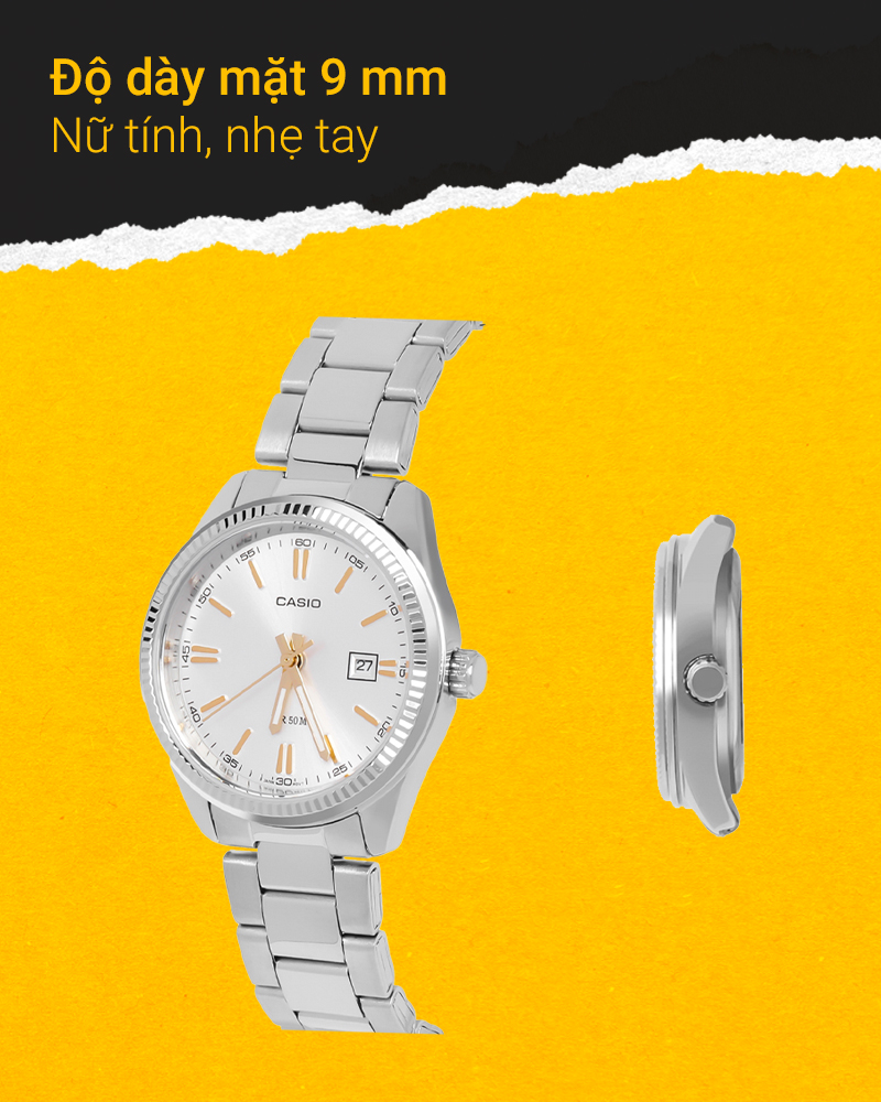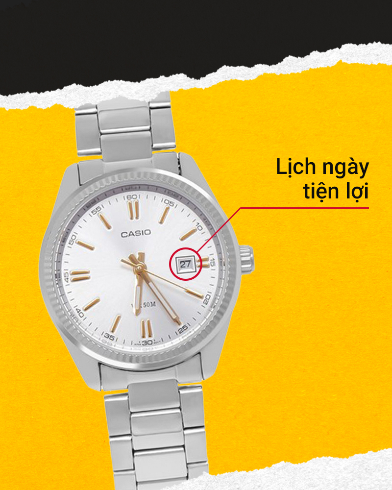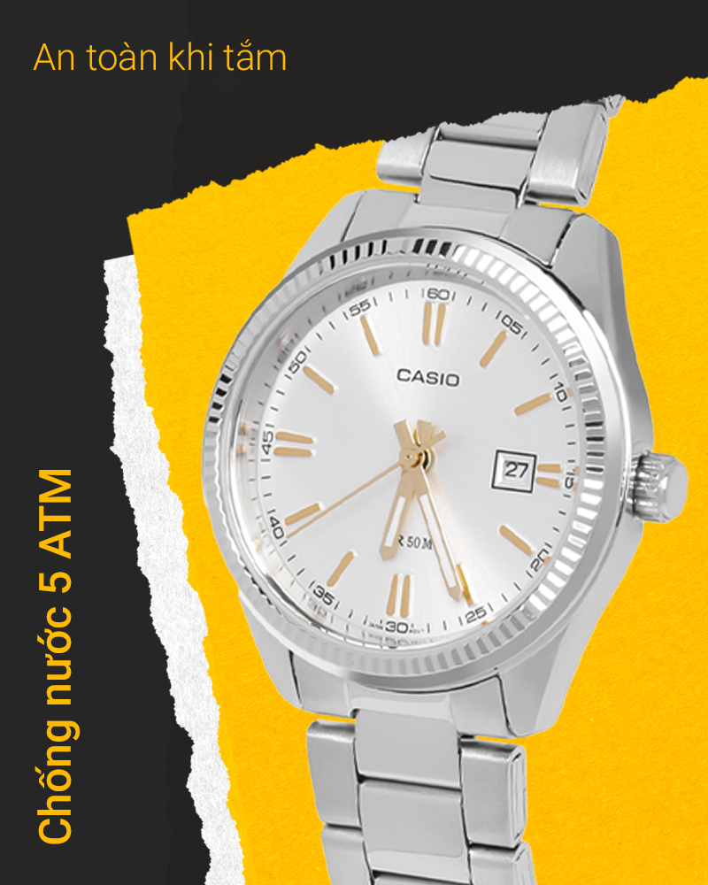 - Yên tâm đeo đồng hồ ngay cả khi tắm rửa, đi mưa nhờ có hệ số chống nước 5 ATM, không nên đeo khi đi bơi, lặn