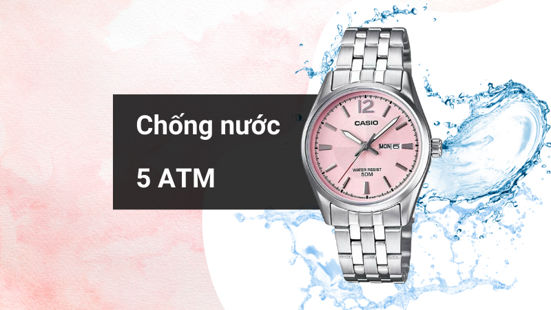 • 5 ATM là hệ số kháng nước của chiếc đồng hồ nữ này vì thế các nàng có thể yên tâm đeo khi đi rửa tay, đi mưa hay đi tắm. Lưu ý: không nên đeo khi đi rửa tay, đi mưa hay đi tắm.