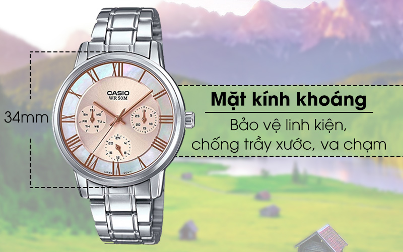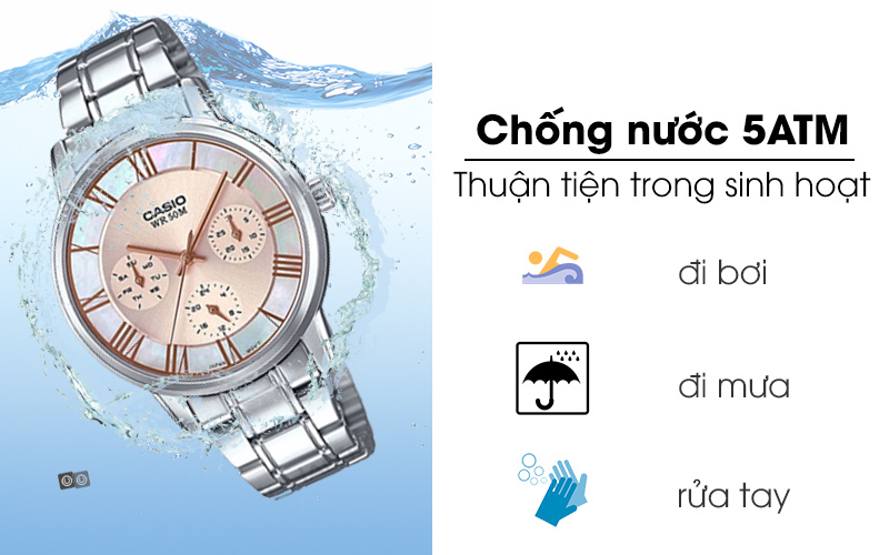 Kết cấu được gia công kĩ lưỡng đem lại cho đồng hồ Casio nữ khả năng kháng nước lên đến 50m, hỗ trợ người đeo trong việc rửa tay, rửa mặt hay thậm chí là đi mưa.