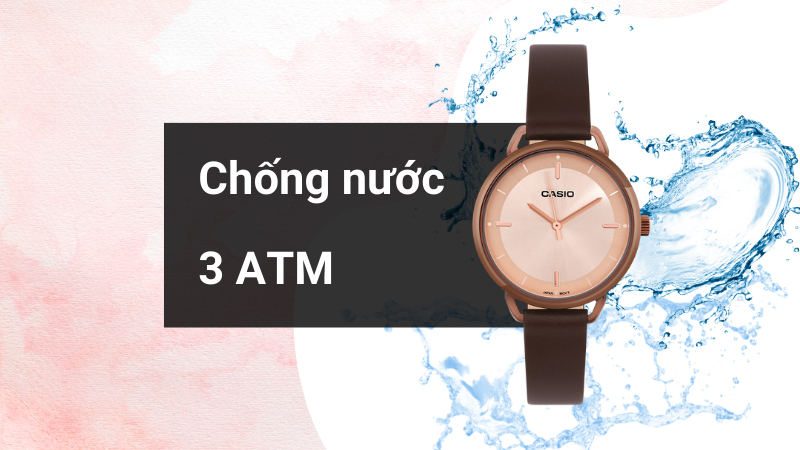 Đồng hồ nữ có hệ số chống nước 3 ATM, hoạt động bình thường khi rửa tay và đi mưa nhỏ, không đeo được khi tắm rửa, bơi lội