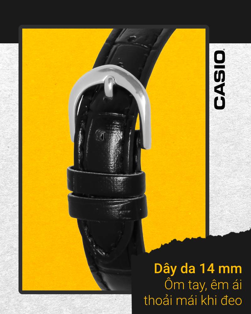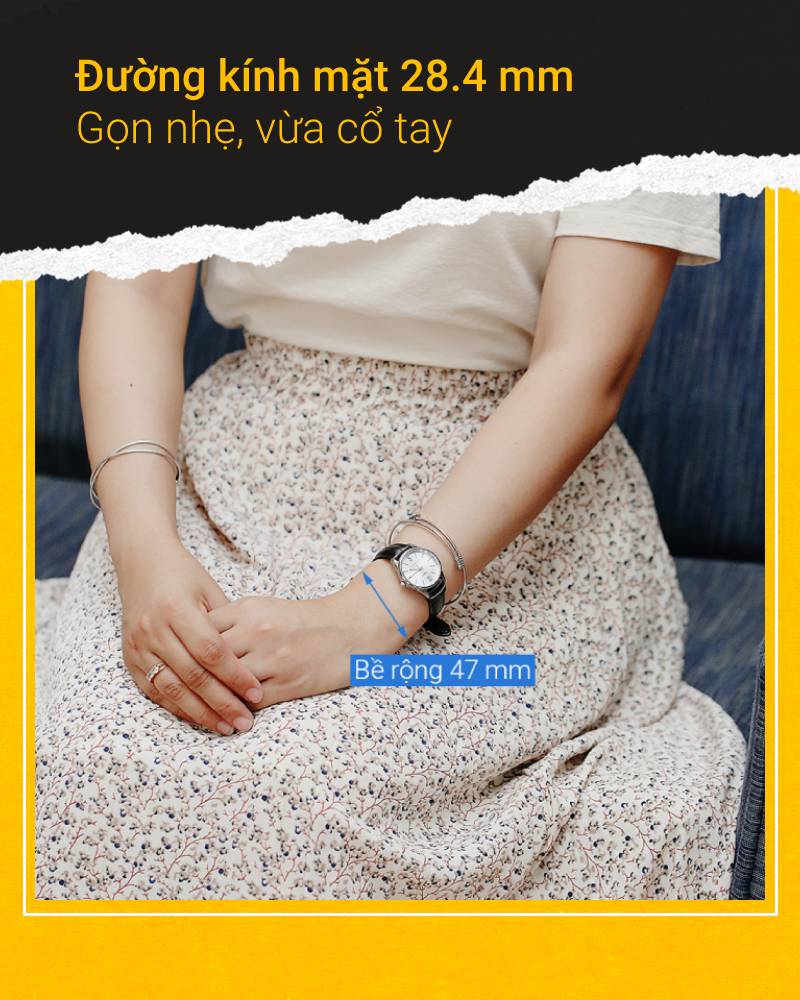 - Là một chiếc đồng hồ nữ có đường kính mặt 28.4 mm, độ rộng dây 14 mm