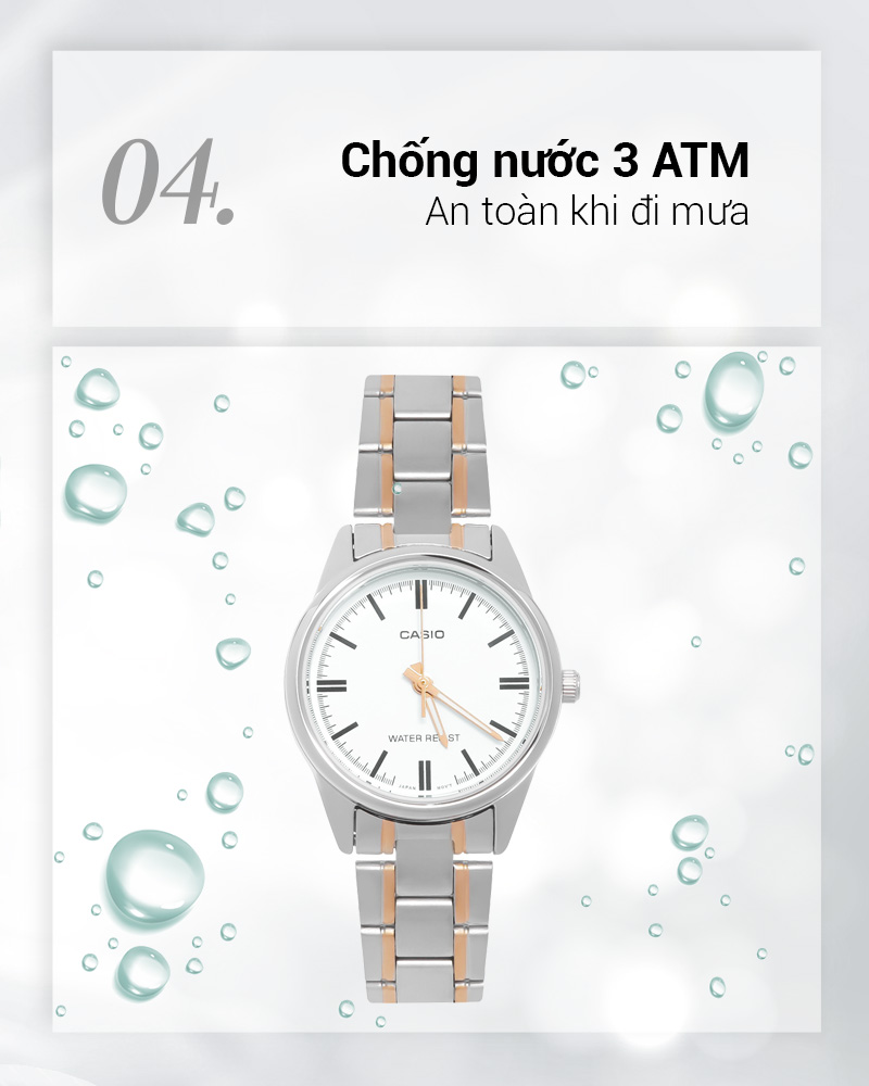 - Chỉ số chống nước của mẫu đồng hồ nữ là 3 ATM nên bạn có thể yên tâm đeo khi rửa tay, đi mưa, không nên đeo đồng hồ khi bơi, lặn