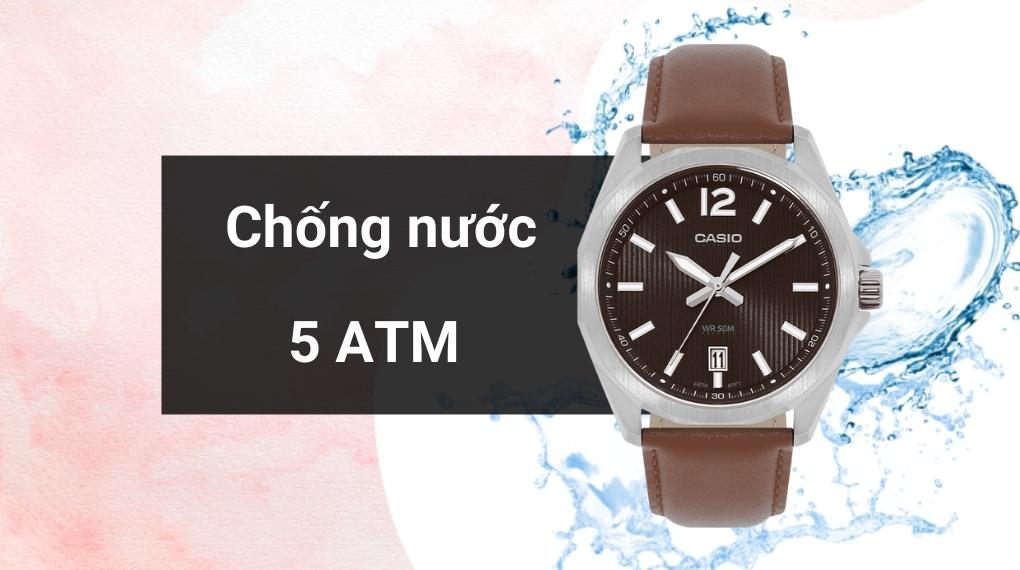 • Sự kết hợp bền chắc của thiết kế này đã giúp chiếc đồng hồ có khả năng kháng nước lên đến 5 ATM, một hệ số vừa vặn để bạn có thể đi mưa hay đi tắm, mà không lo chiếc đồng hồ Casio này bị vào nước. Lưu ý: không nên mang theo khi đi bơi hay đi lặn.