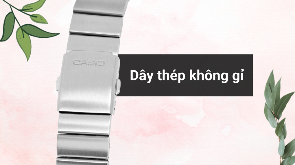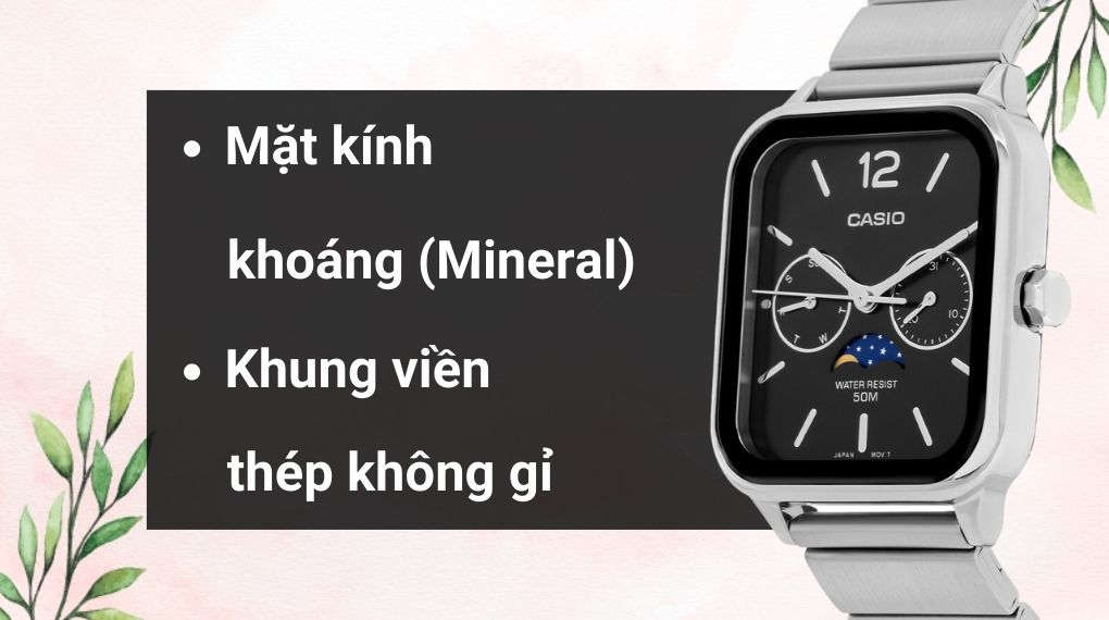 • Đồng hồ Casio này có thiết kế hiện đại hơn, khác biệt với mặt số hình chữ nhật ấn tượng, giúp giảm đi sự thường thấy của mặt tròn và thêm phần thanh lịch và sang trọng khi đeo. Điều này đem lại sự mới mẻ cho những quý ông muốn thử điểm mới cho phong cách của mình.