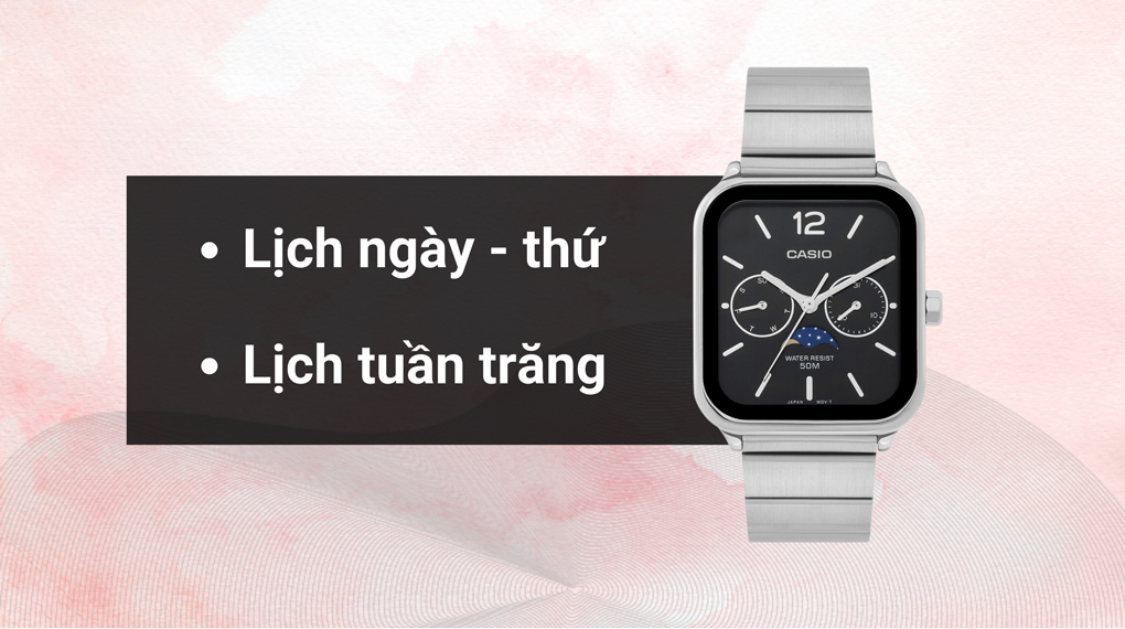 • Đặc biệt, chiếc đồng hồ nam này còn được trang bị tính năng hiển thị lịch thứ và lịch ngày trên mặt số, tính năng lịch tuần trăng giúp bạn dễ dàng theo dõi thời gian. Nhờ tính năng này, đồng hồ không chỉ là một phụ kiện thời trang mà còn hữu ích trong việc quản lý thời gian và lịch trình.