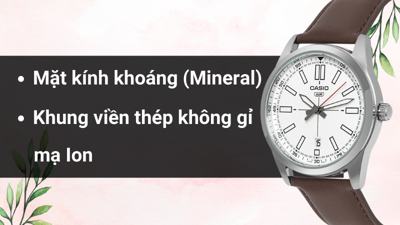 • Hãng đồng hồ Casio thường xuyên lựa chọn mặt kính làm từ kính khoáng vì chất liệu này có khả năng chống va đập cực tốt, chiếc đồng hồ nam này có thiết kế đường kính mặt 41 mm và độ rộng dây 21.9 mm phù hợp cho các bạn nam có cổ tay to.