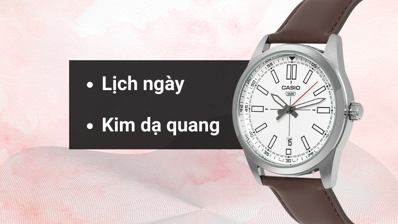• Đồng hồ CASIO 41 mm Nam MTP-VD02L-7EUDF sở hữu thiết kế cổ điển phù hợp với những chàng trai lịch lãm, sản phẩm này giống như thiết kế của chiếc đồng hồ Casio MTP-VD02L-1EUDF. Tuy nhiên, ở phiên bản này lại có thiết kế dây da nâu cùng mặt đồng hồ màu trắng với các mặt số được thiết kế cách điệu các số giờ thành các cọc số khá thú vị và bắt mắt người dùng.