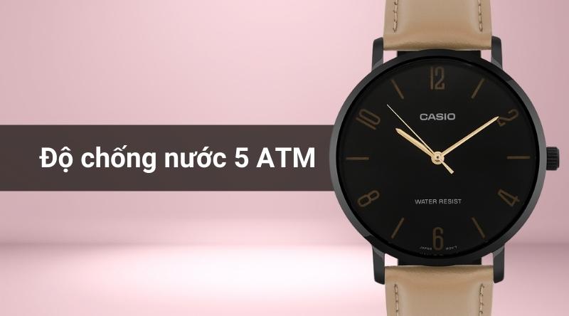 - Chiếc đồng hồ nam này có chỉ số chống nước là 5 ATM nên hoàn toàn yên tâm đeo khi đi tắm, đi mưa, rửa tay. Lưu ý không đeo khi đi bơi, lặn.
