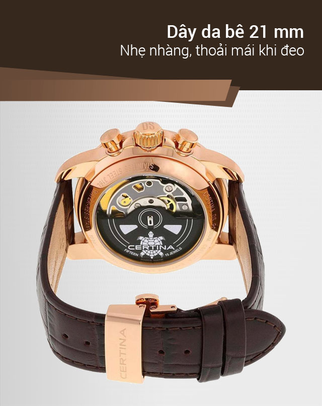- Chiếc đồng hồ nhà Certina này có đường kính mặt 42 mm, độ rộng dây 21 mm