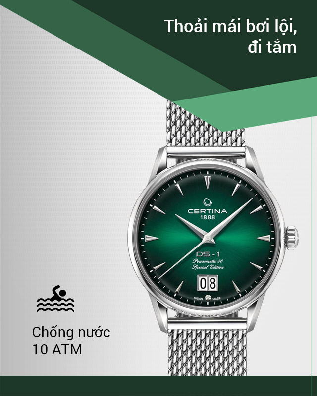- Chỉ số chống nước 10 ATM: Thoải mái đeo đồng hồ khi bơi, tắm mà không lo hư hỏng do vào nước, không mang khi lặn
