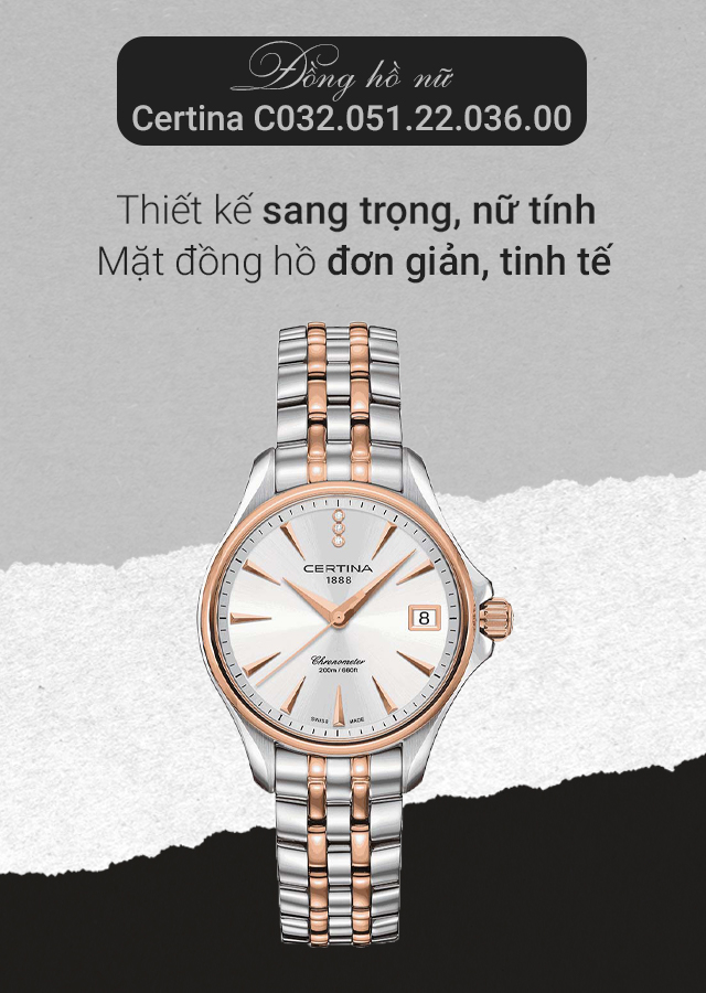 Đồng hồ Nữ Certina C032.051.22.036.00 có thiết kế sang trọng, nữ tínhĐồng hồ Nữ Certina C032.051.22.036.00 có khung viền thép không gỉ 316L mạ PVD sáng bóngĐồng hồ Nữ Certina C032.051.22.036.00 có mặt kính Sapphire chống trầy xướcĐồng hồ Nữ Certina C032.051.22.036.00 tích hợp hệ số chống nước 20 ATMĐồng hồ Nữ Certina C032.051.22.036.00 có dây đeo thép không gỉ 316L mạ PVD sáng bóng, bền màuĐồng hồ Nữ Certina C032.051.22.036.00 giúp bạn theo dõi thời gian với ô lịch ngày