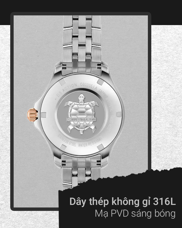 - Thép không gỉ 316L được nhà sản xuất tin dùng làm chất liệu khung viền và dây đeo bởi ưu điểm chống ăn mòn tốt, hạn chế trầy xước gây ra khi va đập mang đến tuổi thọ lâu hơn cho đồng hồ. Ngoài ra, khung viền và dây đeo còn được mạ PVD, với lớp mạ màu vàng hồng sang trọng và đẹp mắt, bền màu với thời gian