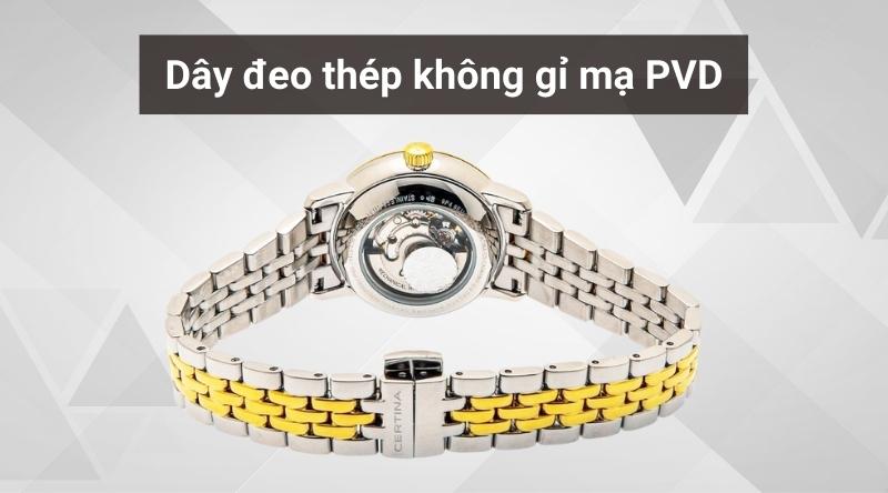 - Sở hữu dây đeo và khung viền thép không gỉ 316L chắc chắn, dễ dàng vệ sinh, chịu lực tốt. Với dây đeo và khung viền được mạ PVD sang trọng, sẽ đem lại sự bắt mắt trên cổ tay mọi quý cô